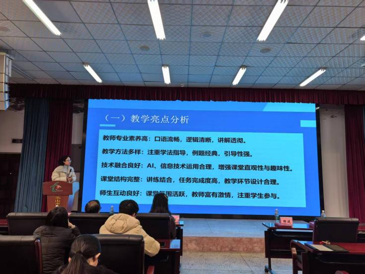 教科室副主任林育霏坦言赛课存在不足:学生主体性发挥不够、AI应用流于形式、学法指导欠缺、教学资源适配性待提升。她提出改进方向:强化高阶思维培养,贯穿学生主体地位;深化AI在作业批改、个性化辅导等场景的应用;通过集体备课开发适配学情的导学案,引入费曼学习法等科学学法;健全青年教师培养机制,落实导师制考核、手写备课听课本、年度论文与公开课等要求。