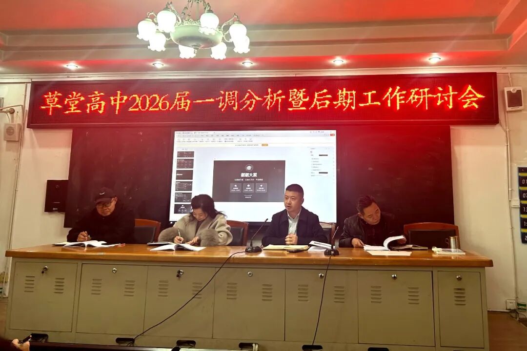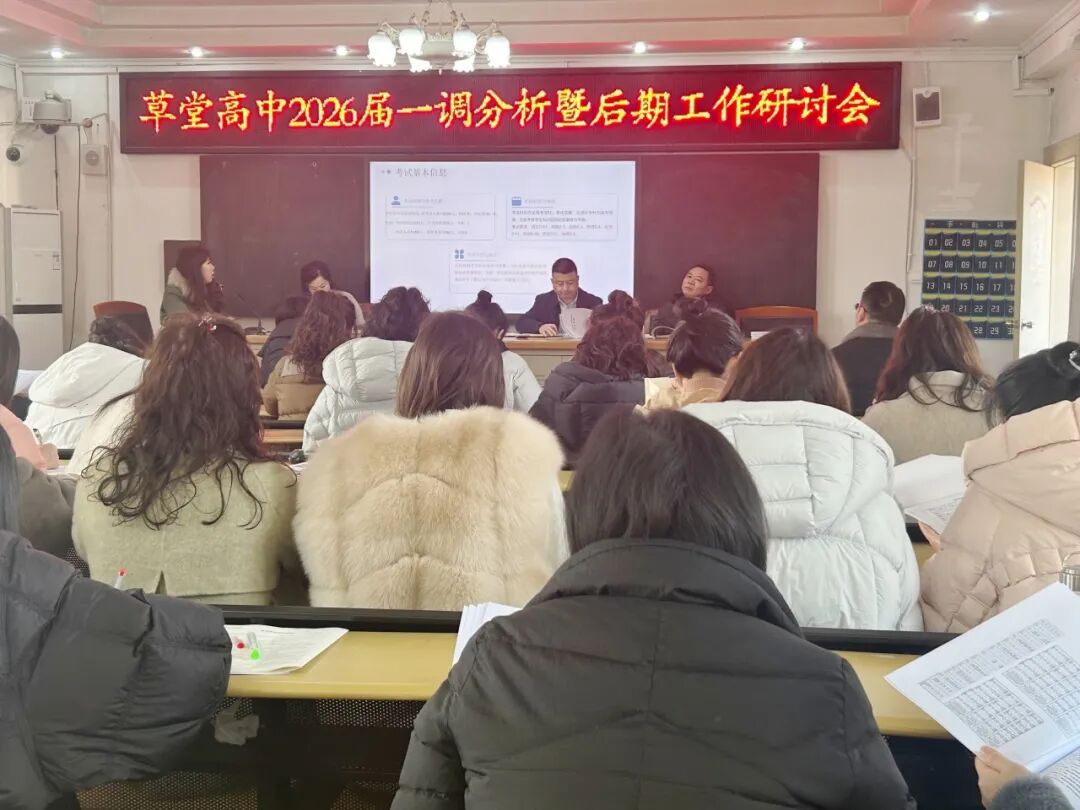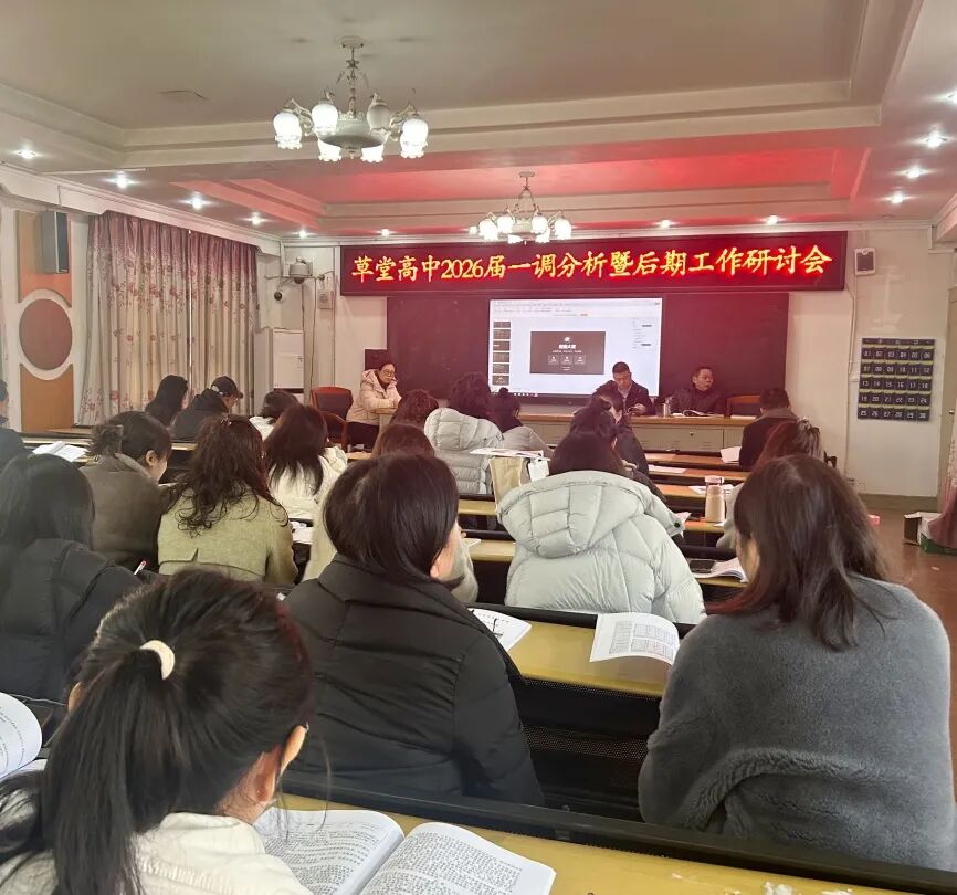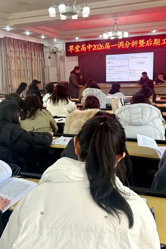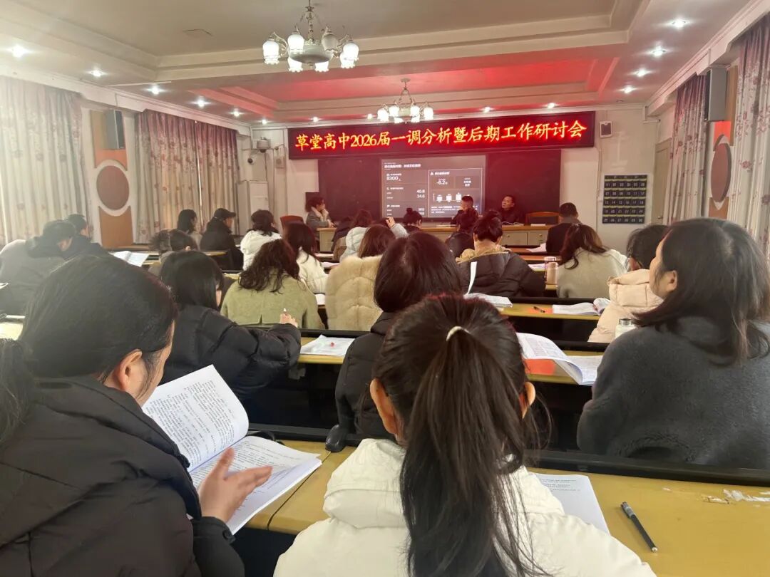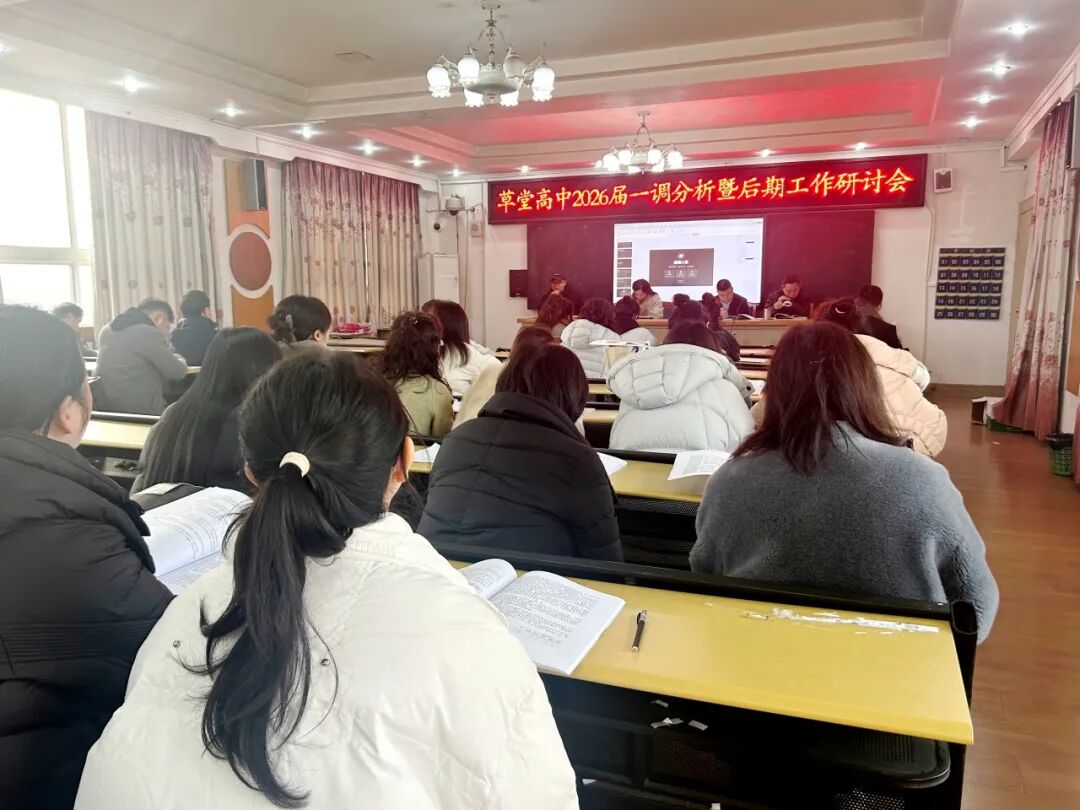 为精准分析学情,优化备考策略,切实提升高三教学质量,1月13日,草堂高中召开了2026届高三一调分析会。学校党委副书记、校长张伟,纪委书记兰贤军,副校长赵雄、蒋羽,教务科副主任梁艳莉,年级主任张泗及全体高三教师参会。
